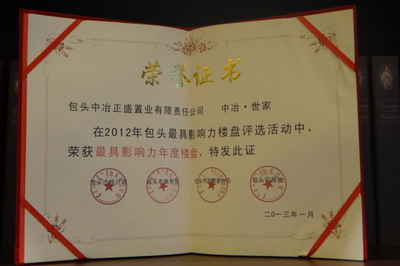 1月28日,由包头市统计局、商务局、消费者协会及包头日报社联合举办的“包头2012年最具影响力年度楼盘”及“包头2012年最佳精装修楼盘”评选结果揭晓,由中冶置业集团开发的“中冶•世家”楼盘喜获两项殊荣。