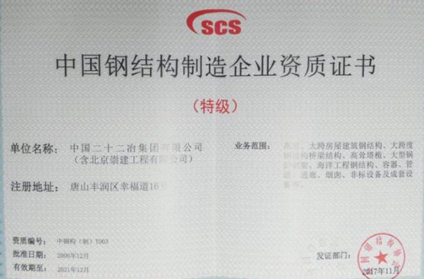 11月17日收到证书,中国二十二冶崇建公司取得中国钢结构制造企业特级资质。