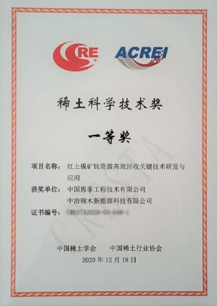 中国恩菲、中冶瑞木新能源荣获“稀土科学技术奖一等奖”