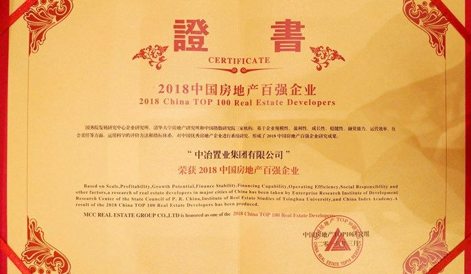 中冶置业荣登2018中国房地产百强名单第40位