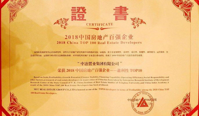 中冶置业荣登2018中国房地产百强企业盈利能力排名第5位