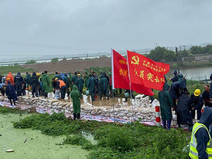 一面面高高飘扬的党旗、一个个冲锋在前的党员、一道道摧不垮的“红色堤坝”,成为安徽芜湖防汛抗洪一线最动人、最亮丽、最暖心的风景。7月19日晚8时30分, 在安徽省芜湖市鸠江区二坝镇防汛救灾现场,十几辆运输车源源不断地把土料装运到堤防上,以党员伍源源为代表的53名中冶建工驰援队员与当地人民解放军和武警部队共同铸成“防汛抢险流水线”,装沙袋、扛沙袋、垒沙袋,军企齐心全力以赴,接力救援争分夺秒。