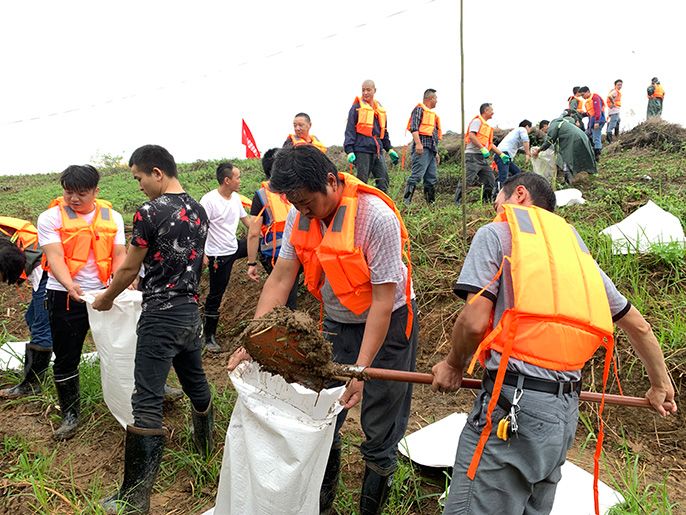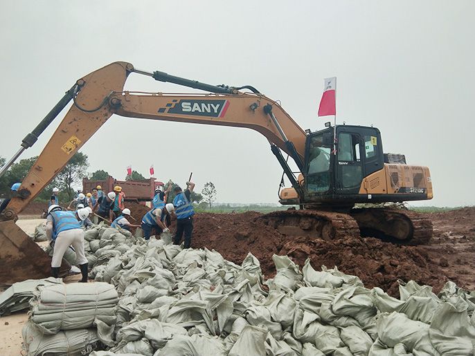 中国十七冶党员突击队全力以赴加高堤坝,将洪水挡住