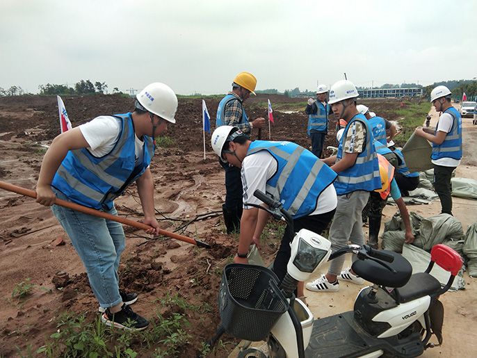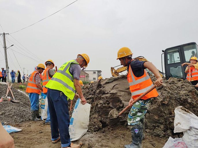 中冶交通项目部员工在支部党员的带领下装填抗洪砂土袋