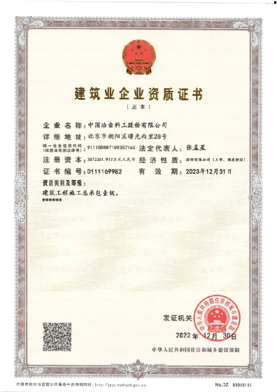 2023年1月16日,中国冶金科工股份有限公司正式被住房和城乡建设部核准授予建筑工程施工总承包壹级资质。资质是企业进入建筑市场的“通行证”和“敲门砖”,对于中国中冶巩固国内市场、拓展海外市场、抢占高端市场具有重要意义。